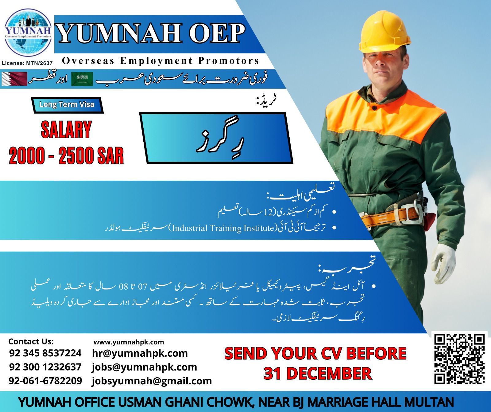Rigger Required for Sudia ArabiaBy / Rigger : 150 Location: Yamnah Office Usman Ghani Chowk, Near BJ Marriage Hall Multan Salary: 2000 – 2500 Positions: Rigger Location: Yamnah Office Usman Ghani Chowk, Near BJ Marriage Hall Multan / Multan Related Posts:Urgent Required for Sudia ArabiaUrgent Requiref or Sudida AraUrgent Required for UAEHome